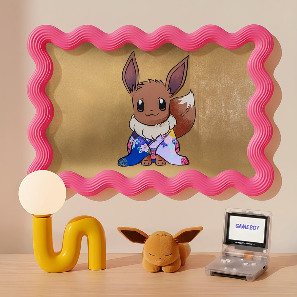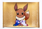 Pokemon fans are sure to love this traditional Japanese twist of Eevee reimagined in a sumptuous lilac silk kimono embellished with lovely pastel colors with traditional Japanese flower motifs and decorative gold serving as an elegant backdrop.